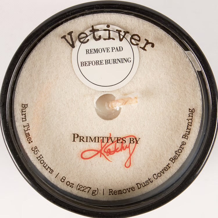 Candle displays a double-sided design of vintage bat art with "Happy Halloween" sentiment on matte black glass. Seasonal candle features soy-based wax and a fabric wick with 35 hours of burn time activating a refreshing Vetiver scent. Candle includes a dust cover and plastic lid