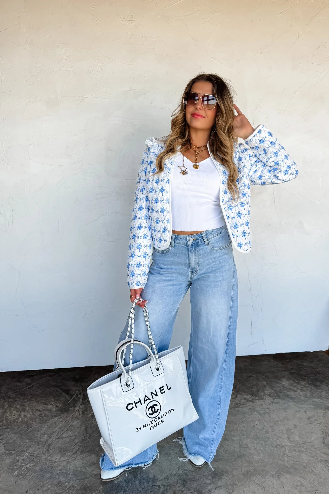 This cropped jacket features a structured, collarless silhouette with a subtle quilted texture and an allover blue floral and bow print on a crisp white background.