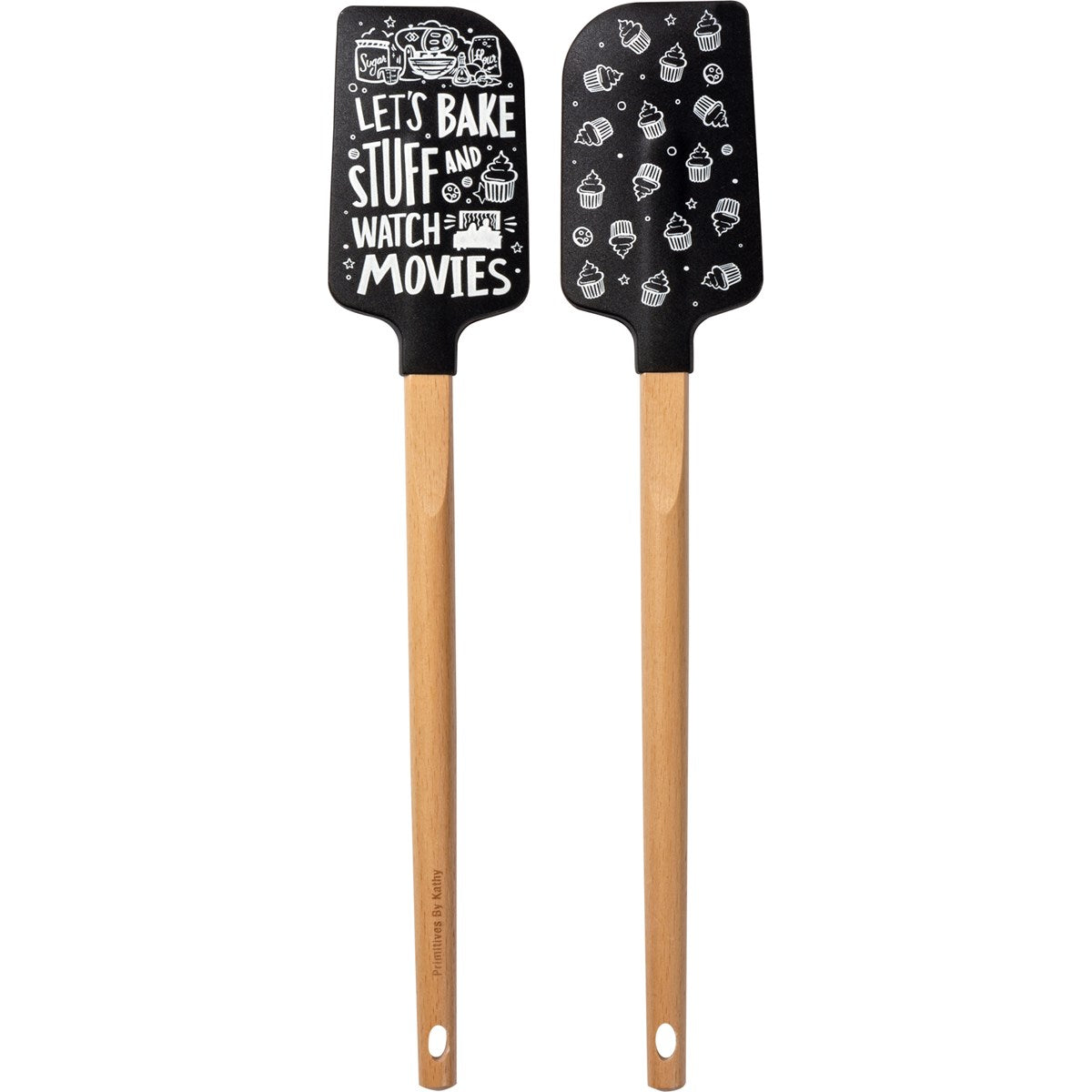 A silicone spatula with a wooden handle. Features sentiment on front and complementing designs on back. Handles feature laser cut logos and drilled hole with ribbon loop for easy hanging. Heat resistant up to 375 degrees Fahrenheit.